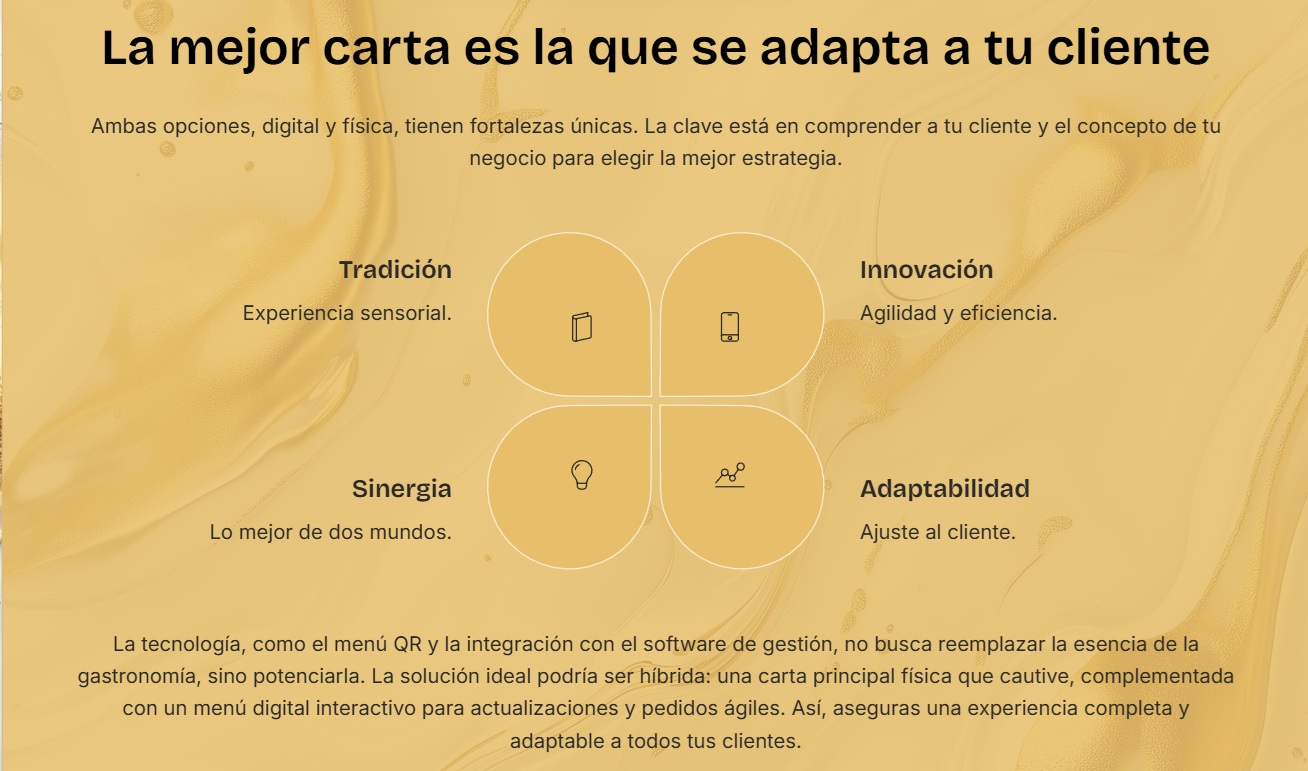 La carta digital, como un menú QR enlazado a un software de gestión gastronómico, brinda agilidad y actualización constante. Permite integrar tecnología para una experiencia más fluida y moderna. Ambas opciones pueden coexistir, adaptándose al tipo de negocio y a la clientela.