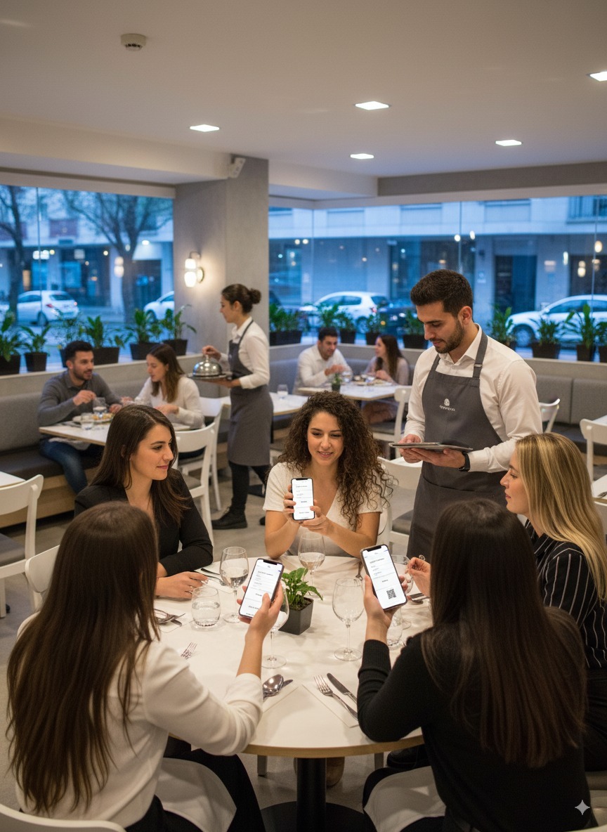 Interactividad: el cliente realiza pedido con su teléfono y genera QR que el mozo escanea y se comparte automáticamente en caja y cocina.